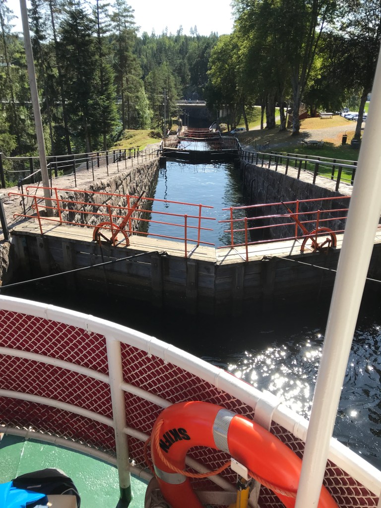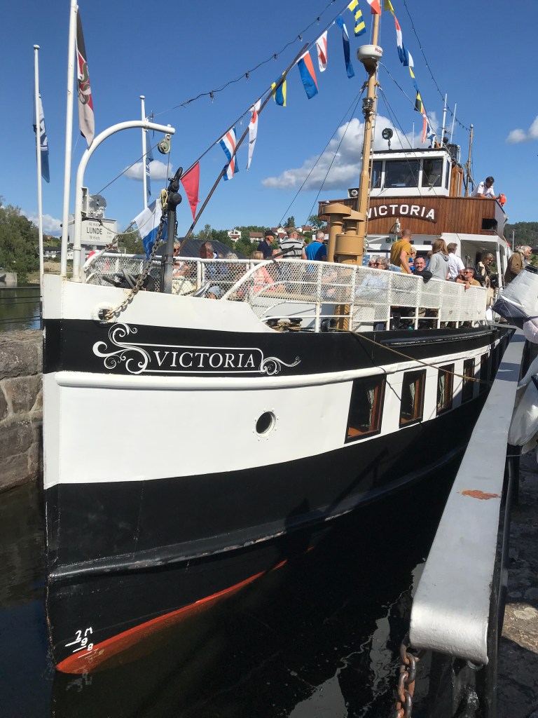 Her gikk vi ombord i veteranbåter Victoria som skulle frakte oss tilbake til Lunde og gjennom de spektakulære Vrangfoss slusene.